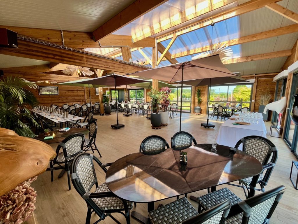 La salle de réception de 150 m² est très lumineuse, accueillante et confortable. Elle s’entoure de baies vitrées qui donnent sur le minigolf 18 trous et ses décors animaliers, les pommiers et la nature environnante.