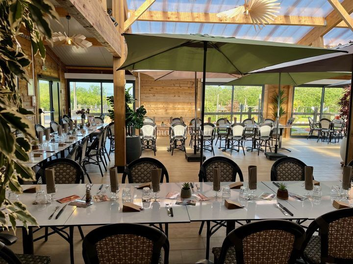 Nous pouvons accueillir 80 personnes assises dans notre salle chaleureuse et chic donnant sur le mini-golf arboré à l’entrée du Verger.